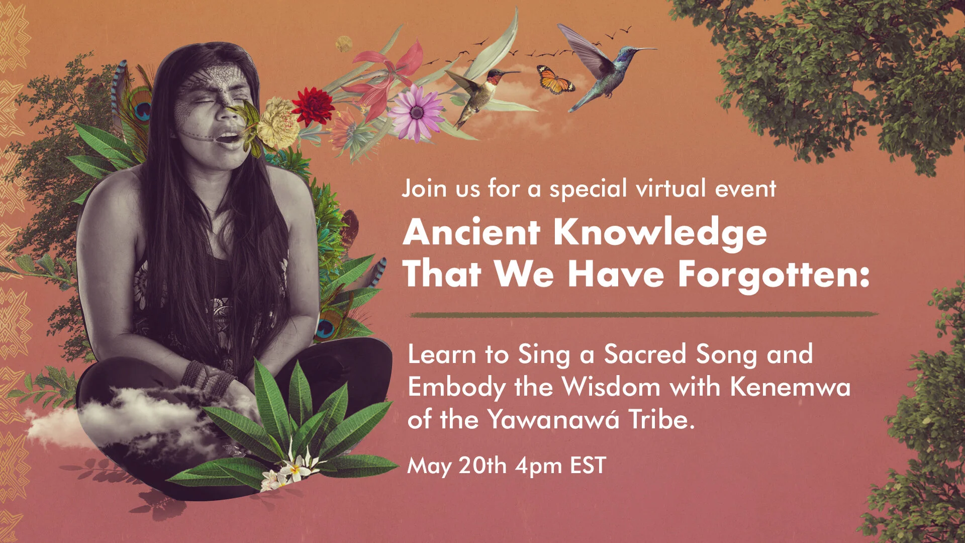 In this two hour sacred workshop, Kenewma, daughter of the first female chief of the Yawanawa people, will share sacred wisdom and teach us a song of her culture so we can use our voices to heal and embody our connection with earth and creator. The name for song in the Yawanawá culture is called 'saiti.' The 'saiti' Kenewma will share is one that calls in the elements of nature- sun, moon, sky, earth, wind- within our very beings. A song to sing when passing through a strong moment, in order to ground and connect with our innate power.